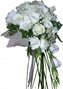Каскадный букет из белой эустомы, гипсофилы и 5 белых роз с зеленью. Длина каскада - 20 см