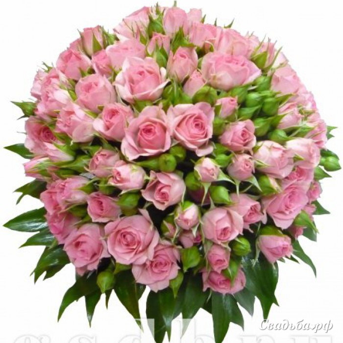 Круглый букет из кустовой розовой розы с зеленью. Диаметр букета - 25 см