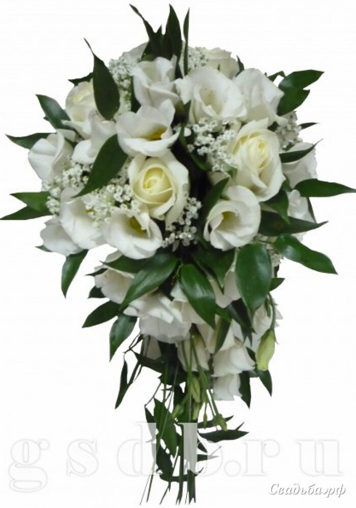 Каскадный букет из белого лизиантуса и белой розы с итальянским рускусом. Длина каскада - 27 см