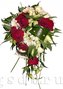 Каскадный букет из бордовых роз, альстромерии, эустомы и аспидистры. Длина каскада - 15 см