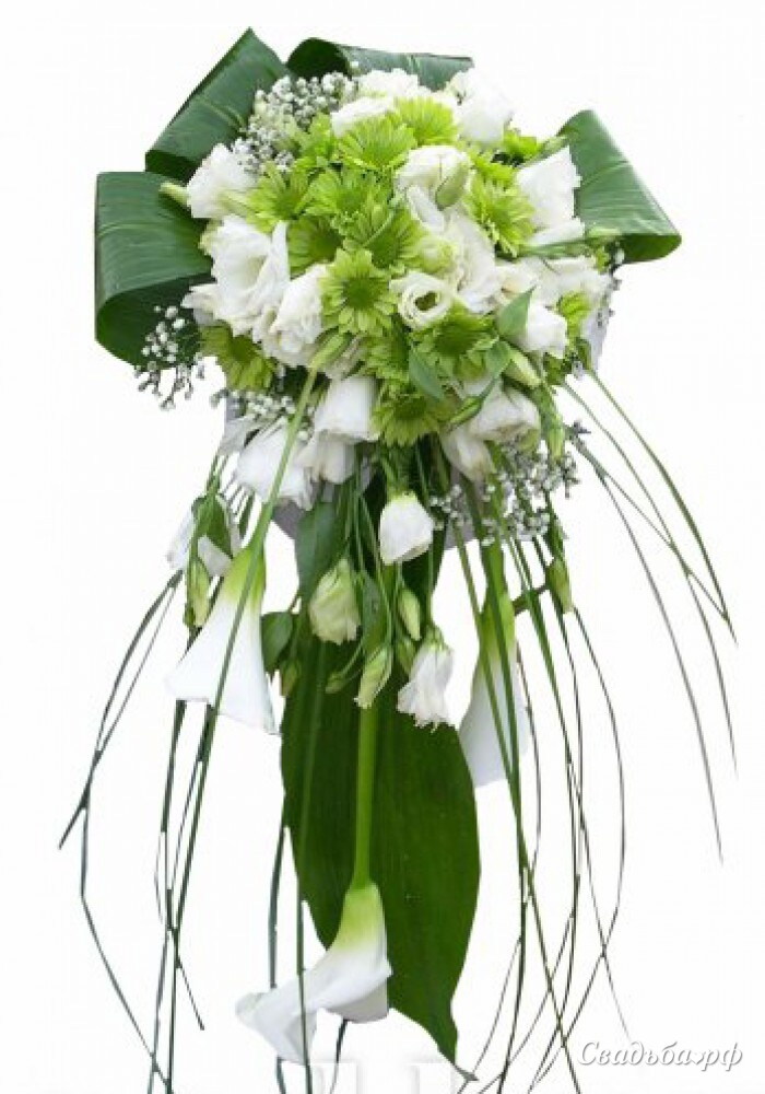 Каскадный букет из 3 бутонов белой орхидеи, белого лизиантуса и зеленой хризантемы. Длина каскада 18-20 см