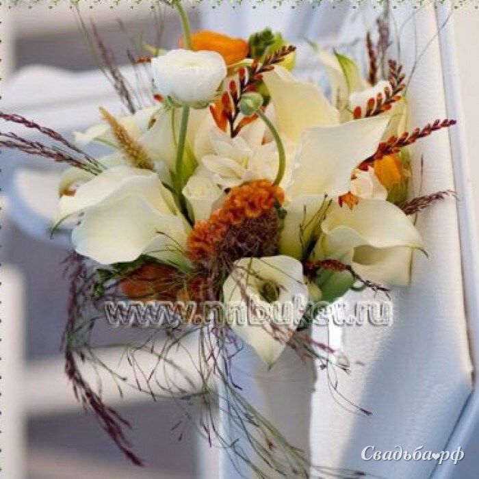 Состав: каллы 11 шт., ранункулюс 5 веток, гладиолус (Япония) 5шт., амарант 4 шт., мискантус 3 ветки, лента.