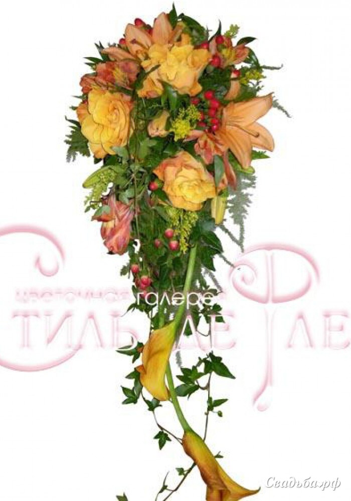 Свадебный яркий каскадный букет из лилий, желтых кал, роз и ягод.