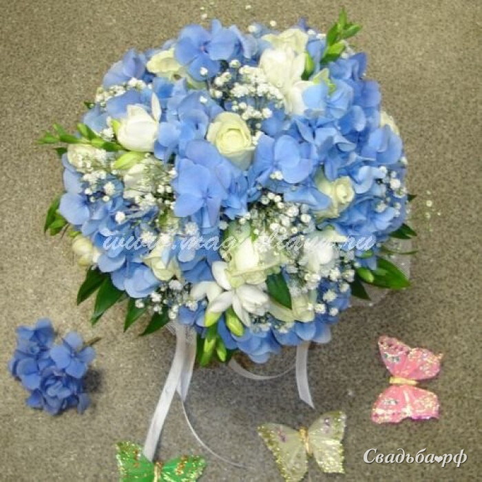 Гортензия синяя, фрезии белые, розы белые, рускус.