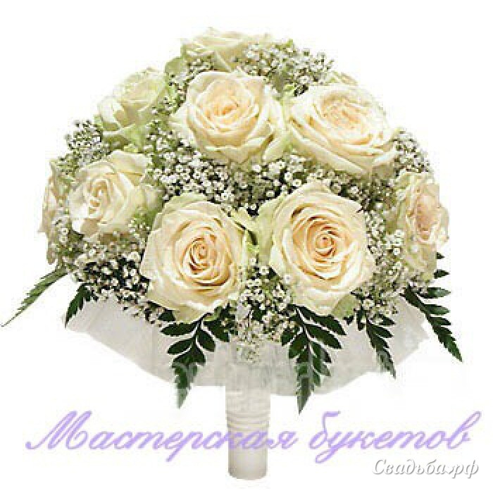Состав: роза кремовая-15шт.,гипсофила-2шт.,папоротик-4шт.,манжетка,п/б-1шт.,лента атласная