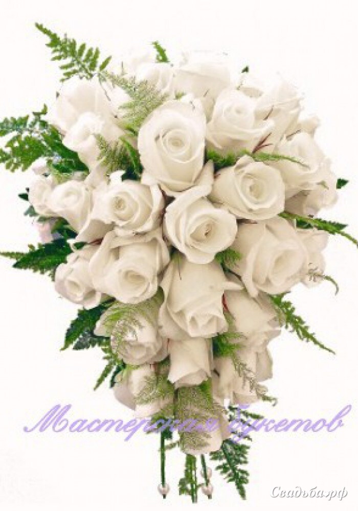 Состав: роза белая-31шт.,сетаус-7шт.,берграс,декоративные бусы,п/б-1шт.,лента атласная