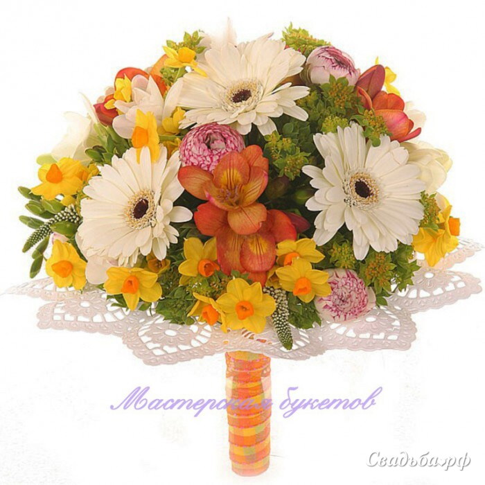 Состав: Гербера-7шт.,нарцисс-10шт.,анемоны-7шт.,фрезия-10шт.,вероника-7шт.,буплерум,п/б-1шт.,манжетка,лента атласная