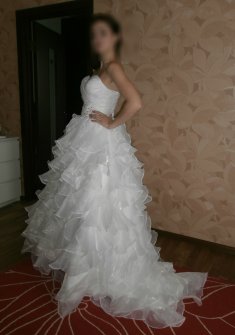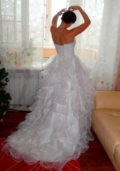 Красивое свадебное платье белого цвета. Пышная многослойная юбка, корсет на шнуровке. Верх платья задрапирован и украшен небольшими кристаллами.