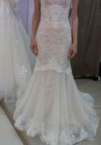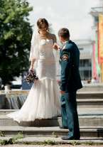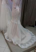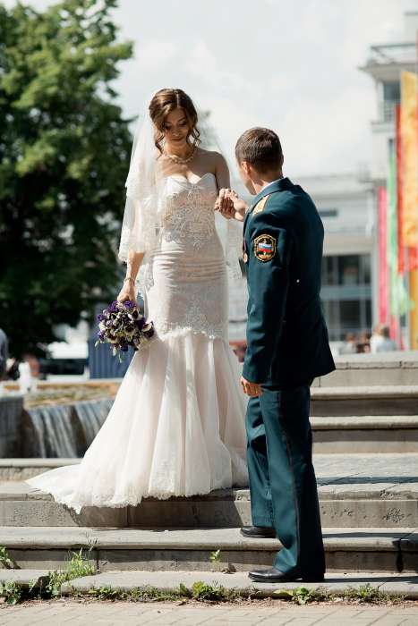 Утонченное платье с небольшим шлейфом, верх расшит бисером, поэтому платье деликатно поблескивает на солнце. Сзади имеется шнуровка с атласом лентой, что позволит идеально подогнать платье по фигуре. Подкладка платья атласная, верх - дорогое кружево. После химчистки.