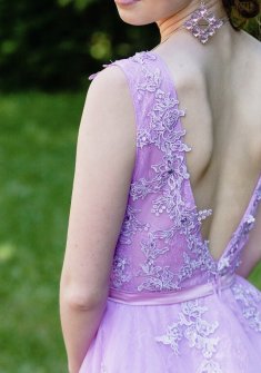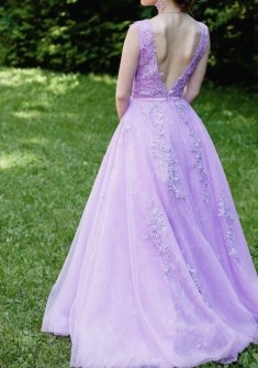 Шилось на заказ в Голландии. Пышное, 6 юбок и все из разной ткани. Очень красиво смотрится. Сиреневое. Надевала буквально на 3-4 часа.