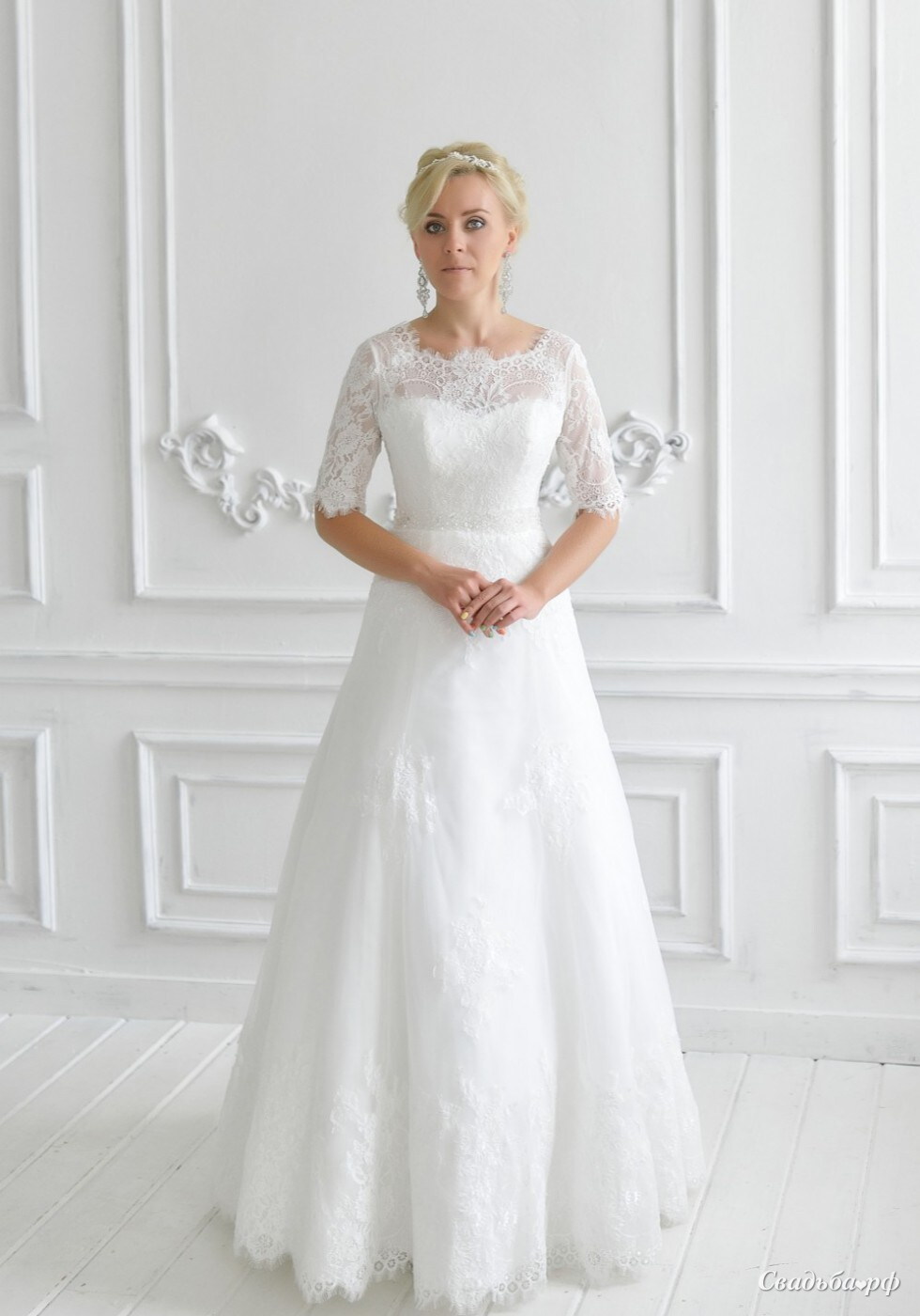 Кружевное свадебное платье с фатиновой юбкой и закрытыми плечами.