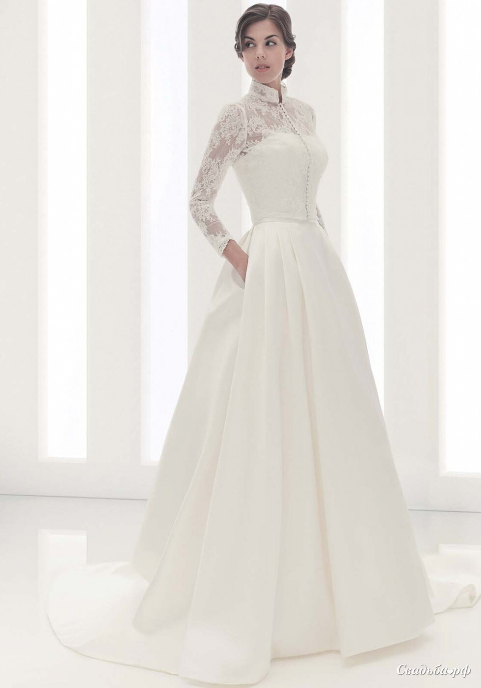 Аристократичное платье в стиле «А-силуэт». Плотный корсет и сложный ажурный жакет с кружевным воротничком-стойкой, создают образ элегантной строгости в сочетании с волнующей женственностью.