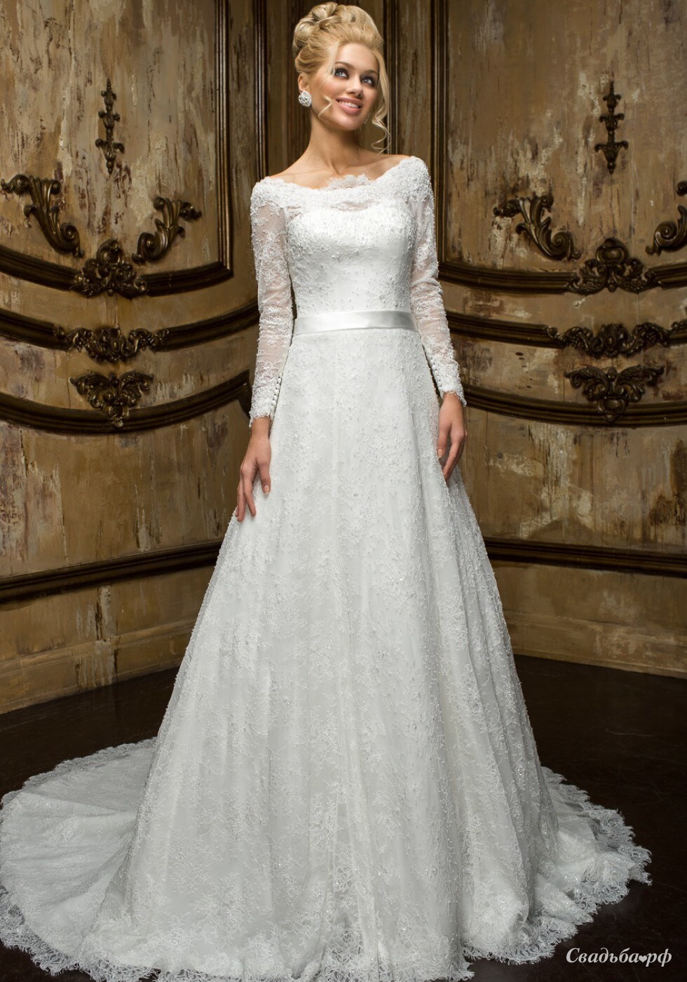 Великолепное платье с рукавом, выполненное из нежного кружево и расшитое кристаллами.