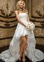 Мода 60-х наполнена игривостью и кокетством. Чистота линий и минимум отделки - вот главные критерии этого стиля. Укороченные юбки , так же характерны для данного направления в моде. Стиль 60-х подходит для смелых и открытых девушек, которые не боятся играть с формой и цветом. Короткое экстравагантное платье с красиво задрапированным длинным шлейфом. Платье изящно обнажает ножки невесты