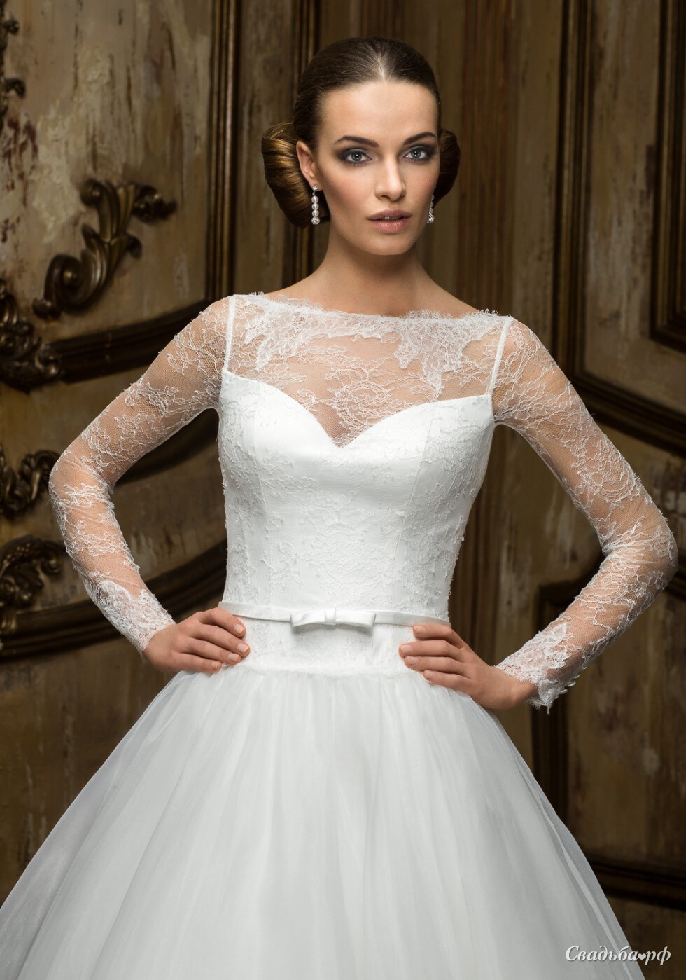 Воздушное свадебное платье с открытым корсета, заниженной талией и сердцевидной линией декольте. Пышная удлиненная юбка. Верхний крой представляет собой блузку под горлышко с длинными рукавами и создает скромный романтичный образ. Декоративную функцию выполняют ряды обшитых тканью пуговок на рукавах в районе манжет и атласный поясок на талии, собранный спереди в аккуратный бантик.