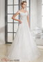 Воздушное и утонченное свадебное платье А-силуэта. Под драпировками нежного тюльмарина прячутся кружевные аппликации ручной работы. Расшитая кружевная брошь придает модели особую роскошь.