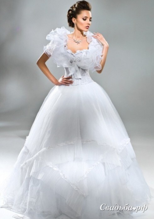 Красивое платье с пышной юбкой. Корсет расшит вручную. Плечи невесты украшает лёгкая накидка.