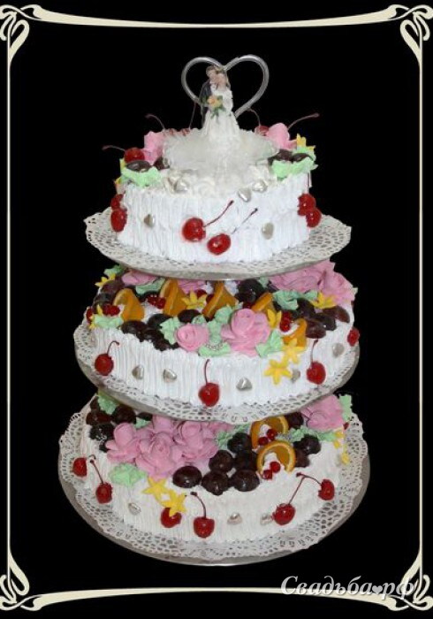 Поверхность торта украшена взбитыми сливками и фруктами. Основа бисквит или медовик со взбитыми сливками или йогуртовым суфле. Масса от 6 кг. Стоимость 1 кг. – 650 руб. Фигурка керамическая 650 рублей.
