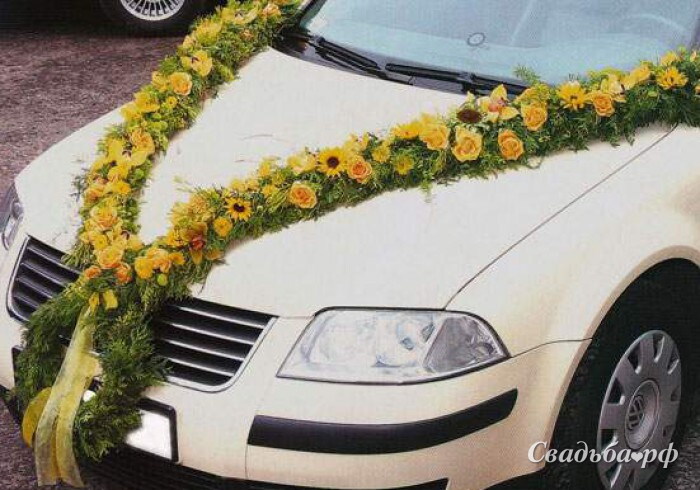 Современная свадьба – это тщательно отрежиссированное театральное действие, немалую роль в котором играют автомобиль и его свадебное украшение. Машина бывает так пышно украшена, что становиться своеобразным подиумом для цветов. Бывает, лишь бархатными лепестками роз, но выглядит элегантно и изыскано. Флористические композиции на свадебной машине гармонично вписываются в дизайн авто, подчеркивают его форму и не станут помехой при езде.